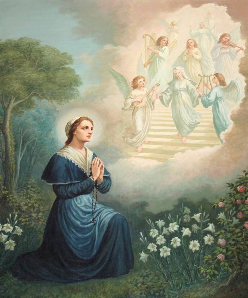 Ed è proprio mentre è in preghiera che la futura Santa ha la visione di una processione di angeli e vergini che suonano e intonano canti. Tra loro, Angela vede anche la sorella defunta che le preannuncia: “Fonderai una compagnia di vergini”. Nei secoli successivi, l’iconografia agiografica raffigurerà tale visione come una “scala celeste” che unisce cielo e terra.