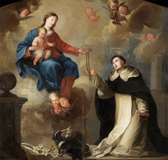 IV. O glorioso s. Domenico, che riceveste immediatamente dalle mani della Vergine, e a tutto il mondo dilataste, secondo il suo comandamento, la divozione efficacissima del Rosario, che operò fin dal suo principio innumerevoli prodigi, otteneteci, vi preghiamo, di essere sempre a vostra imitazione ferventi divotidi Maria santissima e specialmente del suo Rosario, da lei stessa chiamato « Lo strumento » « il più opportuno a confondere l’eresia, a rassodare la fede, a togliere gli scandali, a promuovere le virtù, a moritar la divina misericordia, a sostenere e difendere la santa Chiesa » .